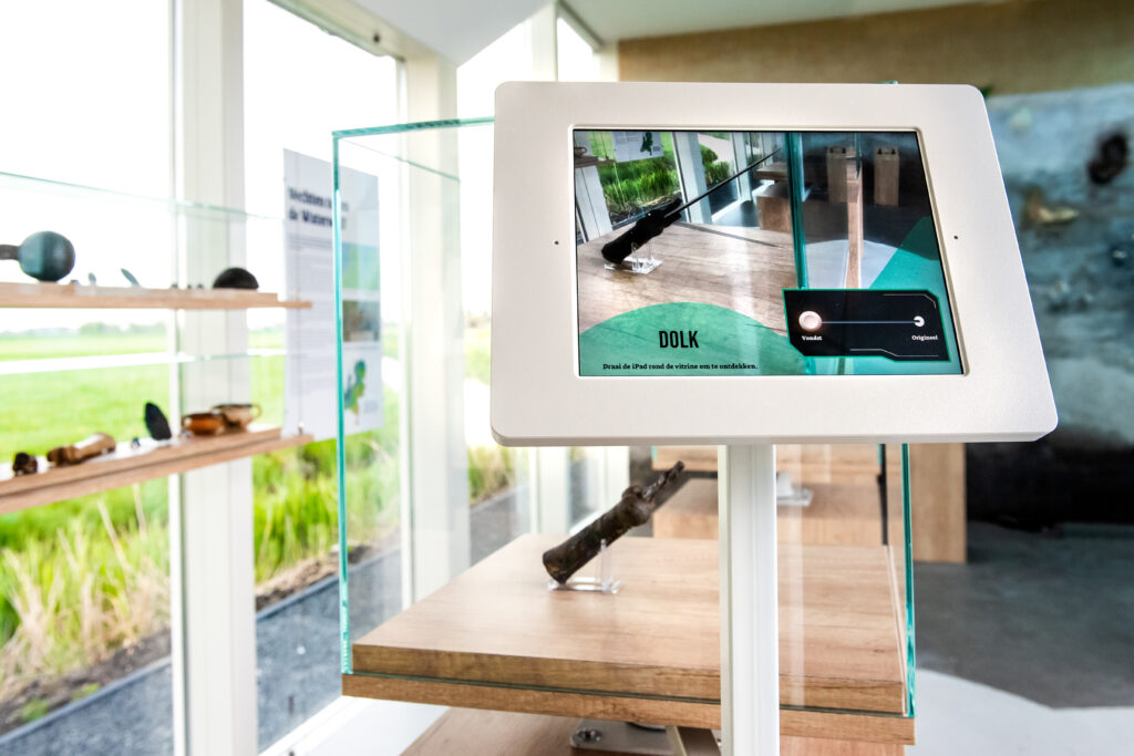 In de vitrines liggen een schoenzool en een stukje van een klotendolk. Op eerste gezichten bescheiden fragmenten, maar zodra je het interactieve scherm gebruikt, zie je hoe de objecten zich voor je ogen reconstrueren. Terwijl je om de vitrine heen loopt, blijft de digitale reconstructie zichtbaar en kun je het object van alle kanten bekijken, alsof het echt voor je staat.